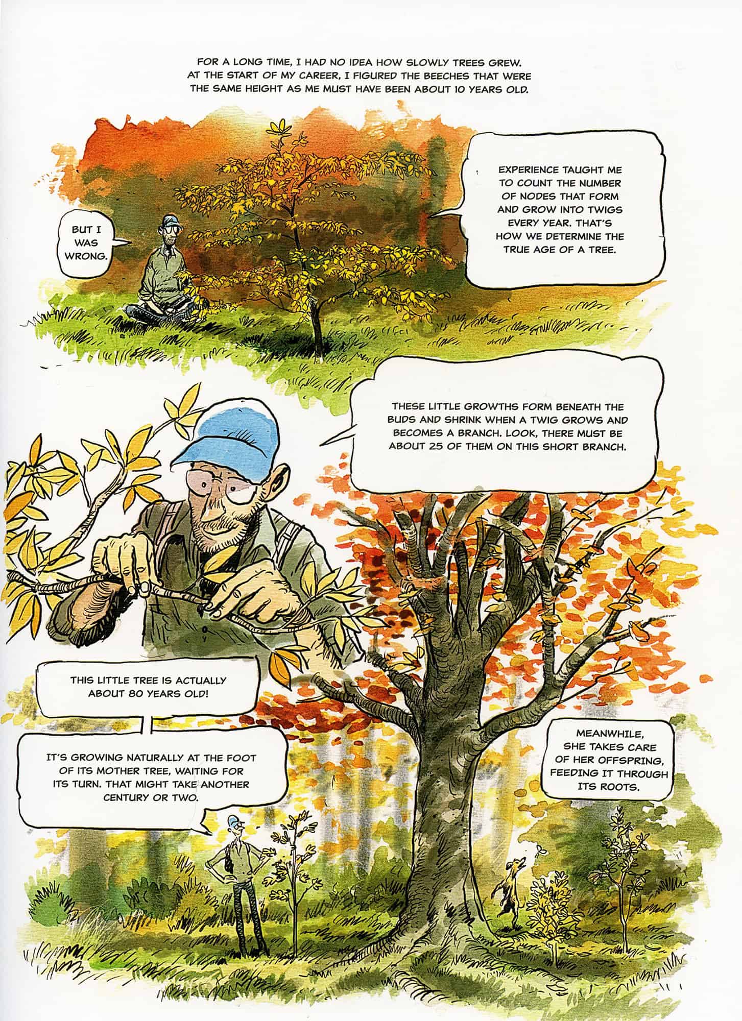 Paljon todella kiinnostavaa tietoa tuli siis eteen ja harmitti, etten lukenut alkuperäistä kirjaa silloin kun se ilmestyi. Sarjakuvasovituksella on kuitenkin monta valttia hihassaan. Ensinnäkin tällaiselle kasvitumpelolle, jolle monet lajinimet eivät hirveästi sano mitään, on kuvitettu sarjakuva todella oivallinen vaihtoehto. Ennen kaikkea Flaon tyyli on kuitenkin juuri sopiva tähän kirjaan. Hänellä on orgaaninen, luonnosmainen ja silti tarkka kynänjälki, mikä tekee jokaisesta sivusta kiinnostavaa katsottavaa. Sarjakuva jossa on sivu toisensa jälkeen puita, puita ja lisää puita, voisi olla jonkin toisen kuvittajan jäljiltä puisevaa luettavaa, mutta siitä ei tarvitse tämän teoksen kanssa huolehtia.