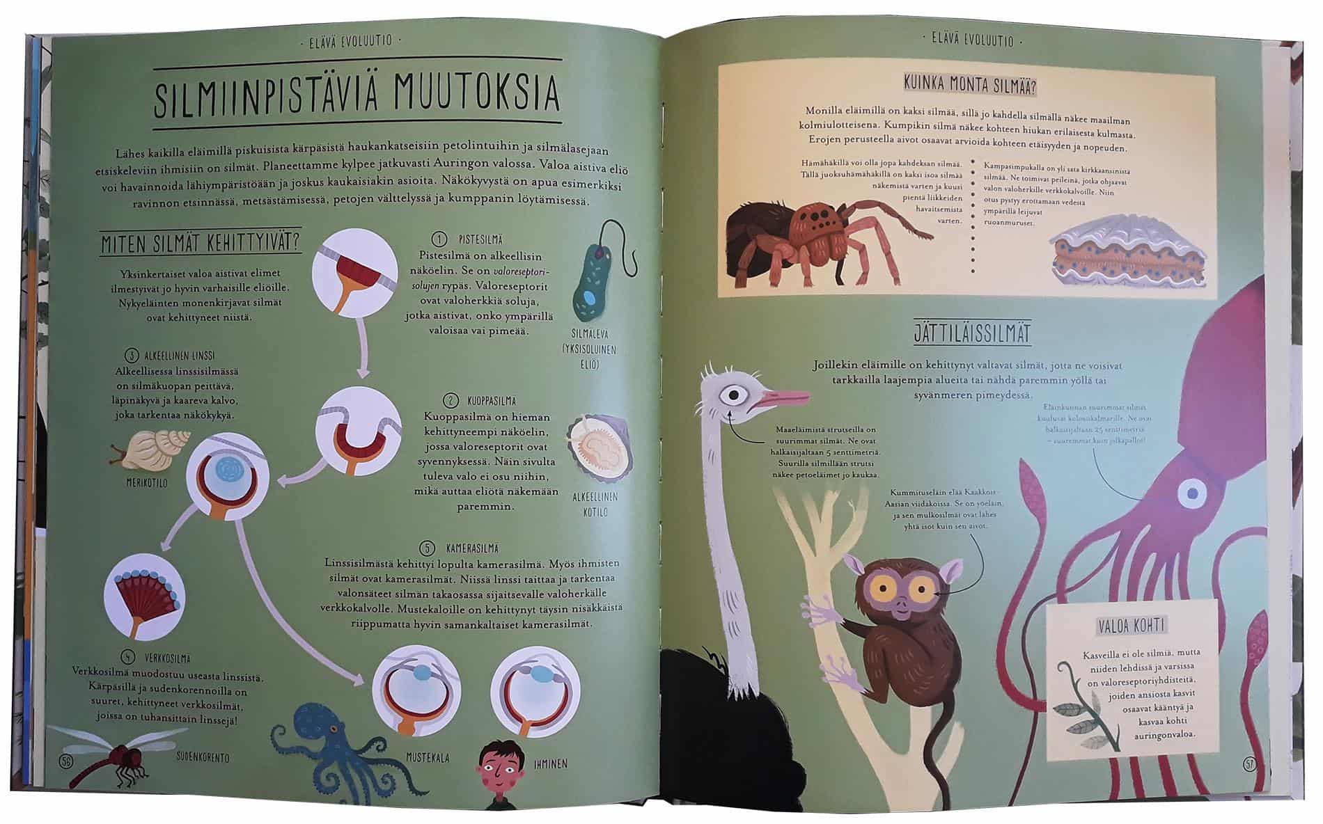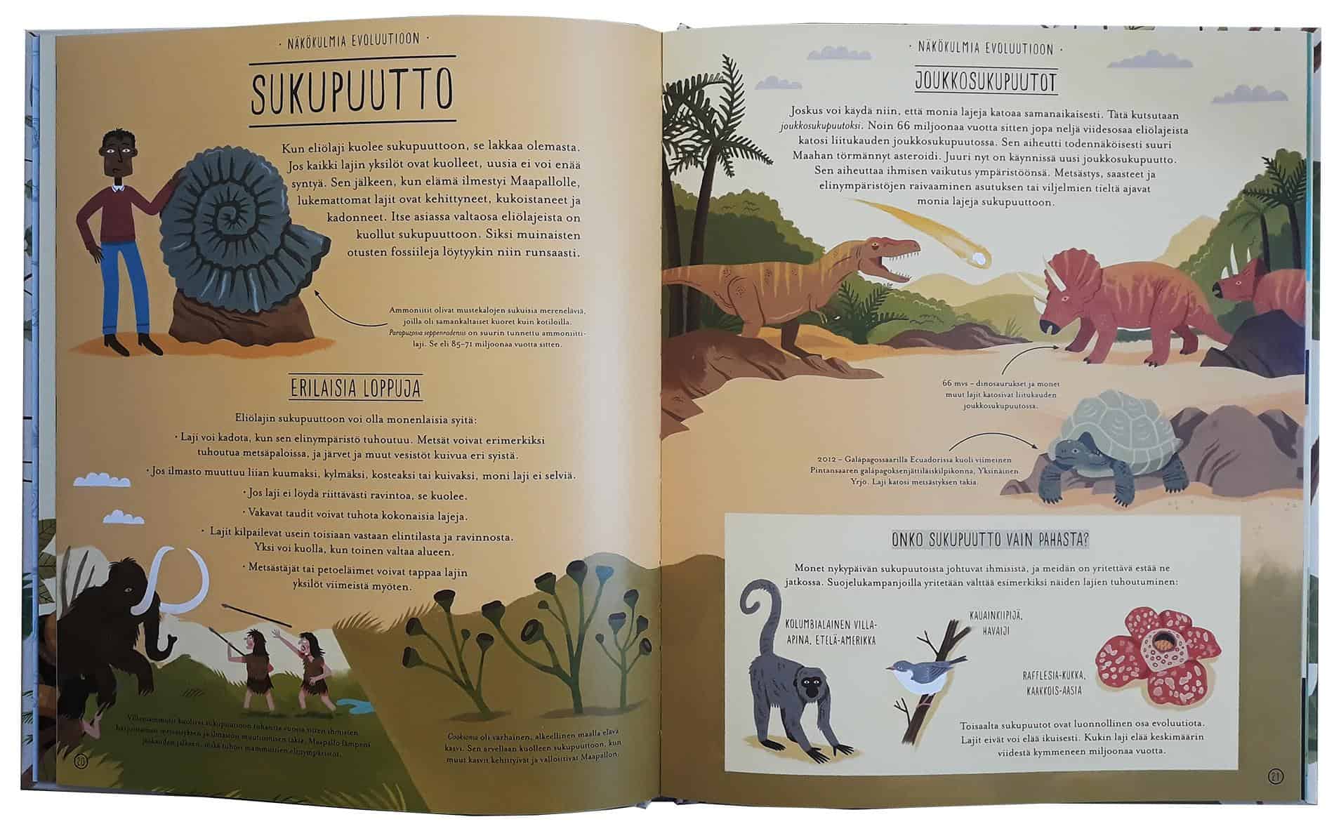 Evoluutio on aiheena mielenkiintoinen, mutta yllättävän harvoin sitä näkyy lastenkirjojen aiheena. Mieleen tulee lähinnä vuonna 2012 ilmestynyt Evoluutio, joka sitten palkittiinkin samana vuonna tiedonjulkistamisen valtionpalkinnolla. Ihmeellinen evoluutio : Elämän tarina on yhtä lailla kunnianhimoinen teos sekin. Aihe ei todellakaan ole niitä helpoimpia, mutta Anna Claybourne on onnistunut paitsi jäsentelemään tiedon hyvin selkeästi niin myös selittämään vaikeatkin asiat helposti ymmärrettävästi. Wesley Robinsin kuvitus tukee myös tekstiä hienosti ja kirja miellyttää heti ensi silmäyksellä.
