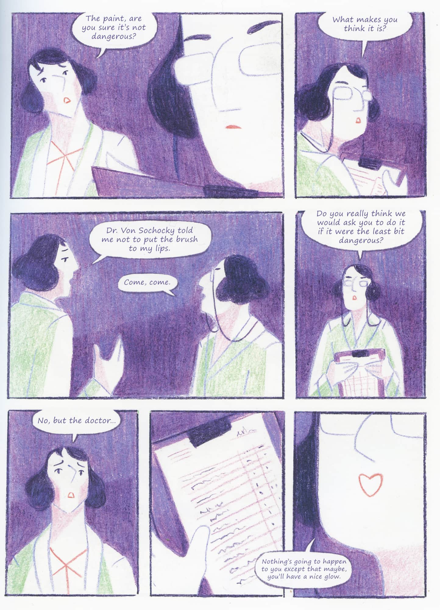 Tarina on sinänsä varsin yksinkertainen. Pidän tositapauksiin ja historiaan perustuvista sarjakuvista ja varsin usein näissä on myös paljon informaatiota, mitä en lainkaan pistä pahakseni. Cyn kerronta on kuitenkin pikemminkin minimalistista ja henkilöihin keskittyvää: hän ei yritä kertoa kaikkea mahdollista, vaan antaa välähdyksenomaisen kuvan eräiden naisten elämästä vuosisata sitten. Kerronnan tehoa korostaa Cyn pelkistetty kuvitustyyli, jonka värityksessä on käytetty vain kuutta värikynää. Violetin ja turkoosin sävyttämä värimaailma toimii, ja varsinkin se miten turkoosia on käytetty korostamaan naisten saamaa säteilyn määrää. Vähäeleinen kerronta ja tenhoava kuvitus toimivat kaiken kaikkiaan erinomaisesti yhteen.