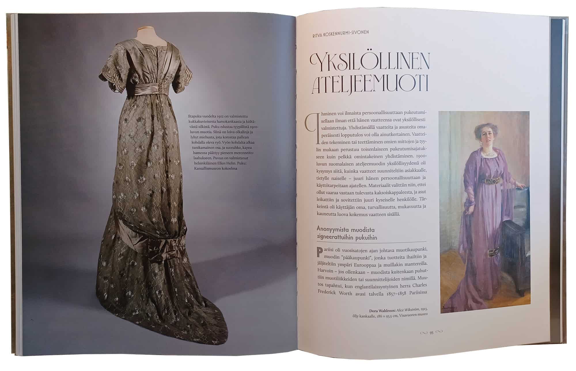 Sen sijaan Ritva Koskennurmi-Sivosen artikkeli Yksilöllinen ateljeemuoti vastaa moneen kysymykseen mitä olen aikaisemmin miettinyt, eli miltä näyttivät huippumuodin ensiaskeleet Suomessa. Pariisi on tunnetusti Haute couturen synnyinsija, mutta kuinka moni tietää, että Haute couturen synty voidaan jäljittää aivan tiettyyn vuoteen, eli vuoteen 1858? Tuolloin Charles Frederick Worth perusti legendaarisen muotitalonsa, ja ensimmäistä kertaa muotia alettiin markkinoida nimenomaan suunnittelijan mukaan.