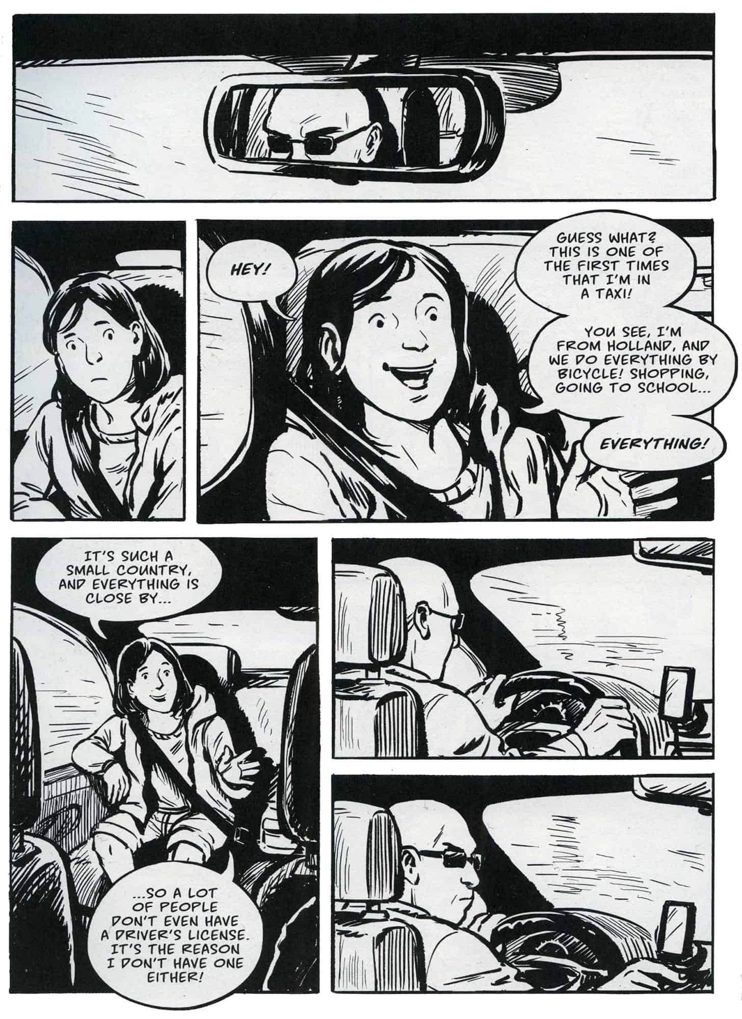 Taksimatkojen taustalla on de Jonghin työ sarjakuvataiteilijana ja animaattorina, johon kuuluu jatkuva matkustaminen alan festivaaleille. Duuni ei ole kuitenkaan se tämän sarjakuvan pihvi, vaan yllättävät ihmisten väliset kohtaamiset. Toisin kuin aluksi luulin, Taxi! ei kuitenkaan koostu neljästä erillisestä tarinasta vaan eri taksimatkat on kudottu yhdeksi ja samaksi kertomukseksi. Tässä tulee esiin de Jonghin kokemus animaattorina – näin luulen – sillä tapa, jolla hän pyörittelee näitä neljää eri kertomusta kohtauksesta toiseen vaihdellen, on toteutukseltaan uskomattoman elokuvallinen.