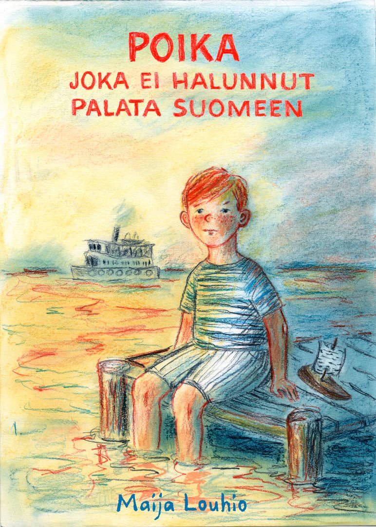 Lappukaulatyttö-kirjan kannessa on sinisellä puuvärillä piirretty kuva pienestä tytöstä pitkässä takissa ja pieni matkalaukku kädessä rannalla, taustallaan poispäin menevä iso höyrylaiva.